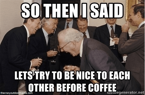 7. Not possible. With our 3 kids still waking up at night, patience gets pretty low. We’ve discussed trying to put forth real effort to be nice in the mornings after a crazy night, but both agreed just not gonna happen. But real love is being real; I acknowledge you’re a crank before coffee and prefer to talk to you later. No hard feelings, just the truth!